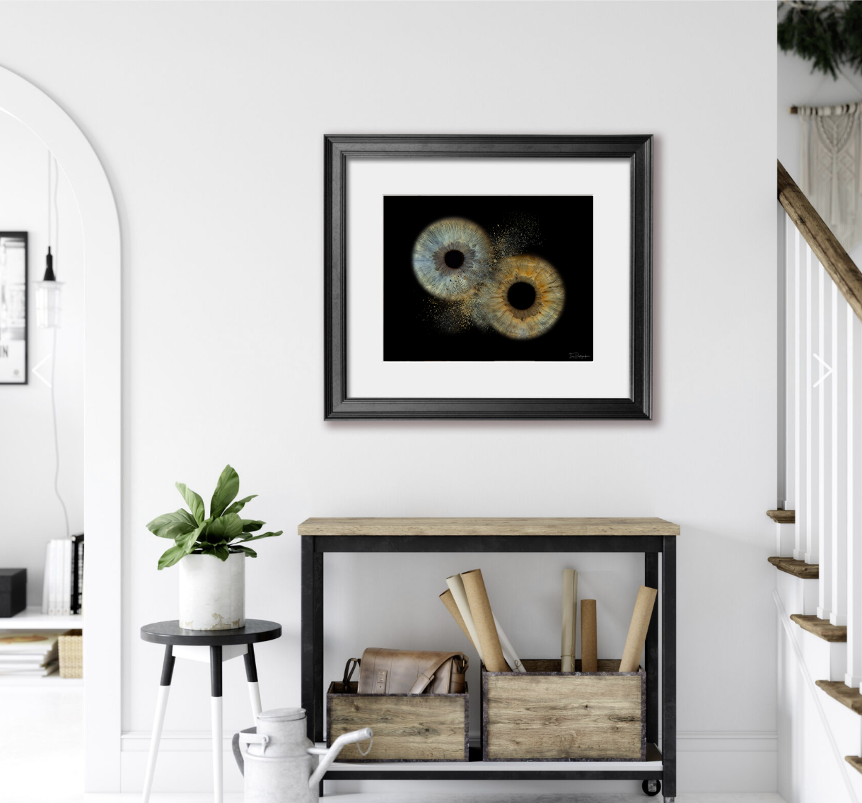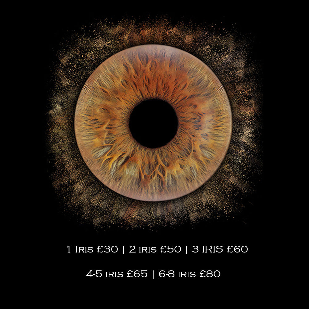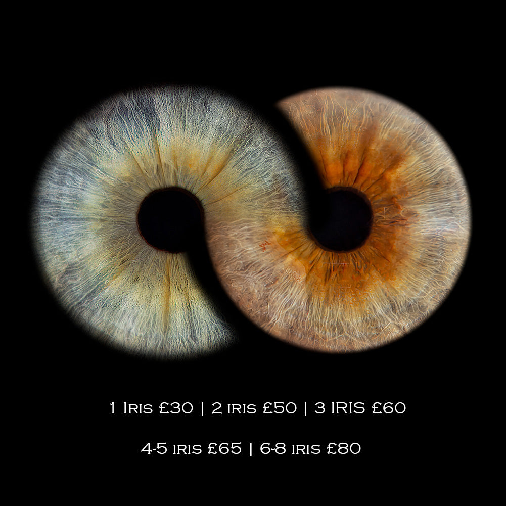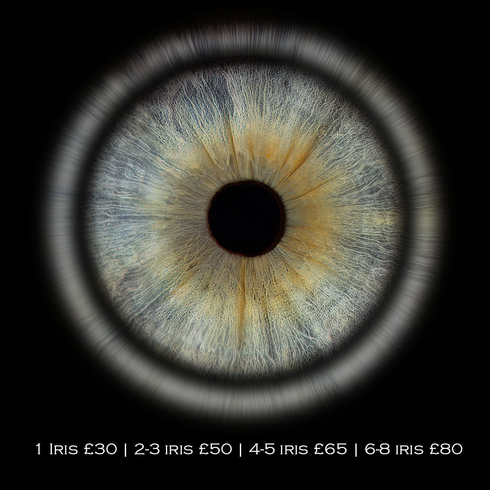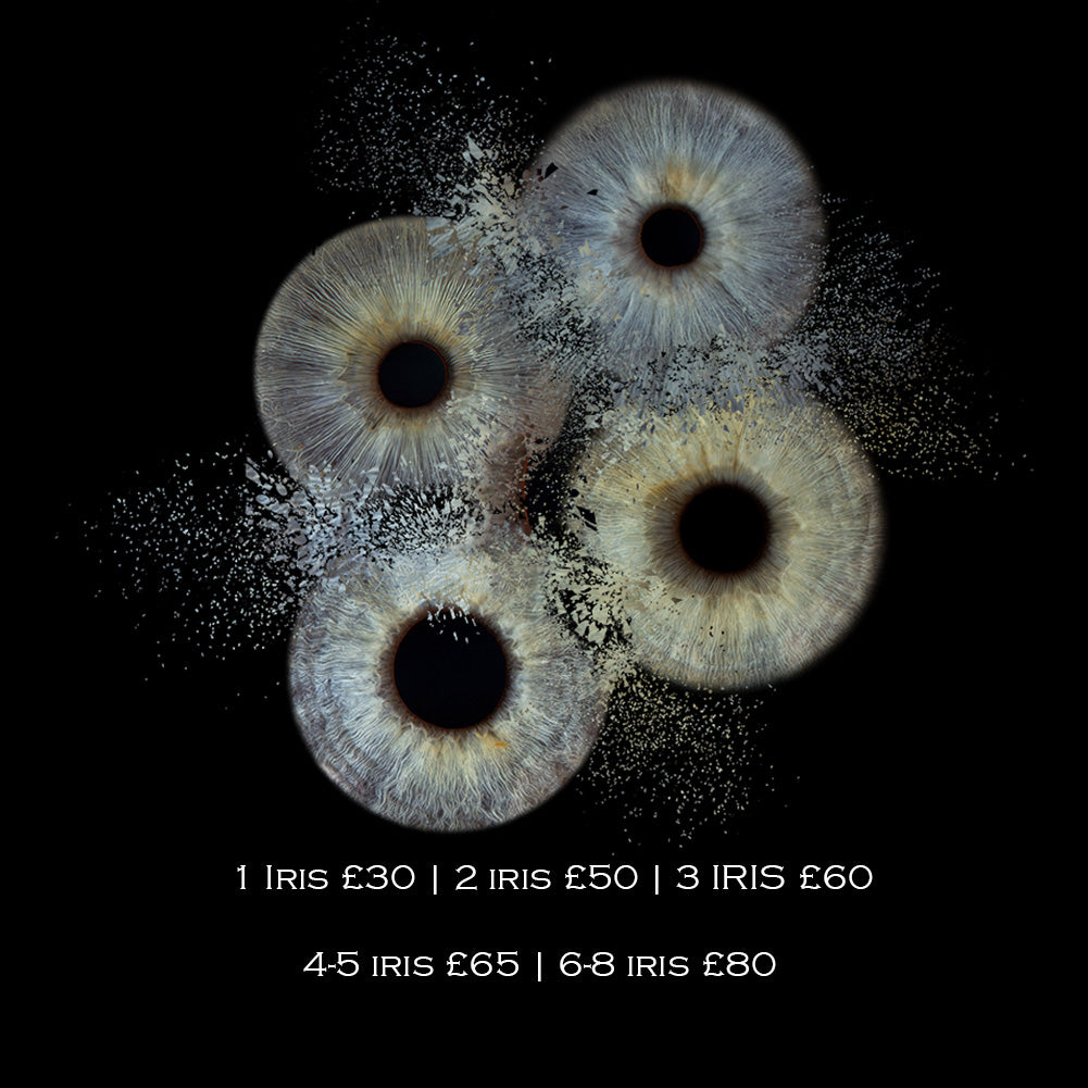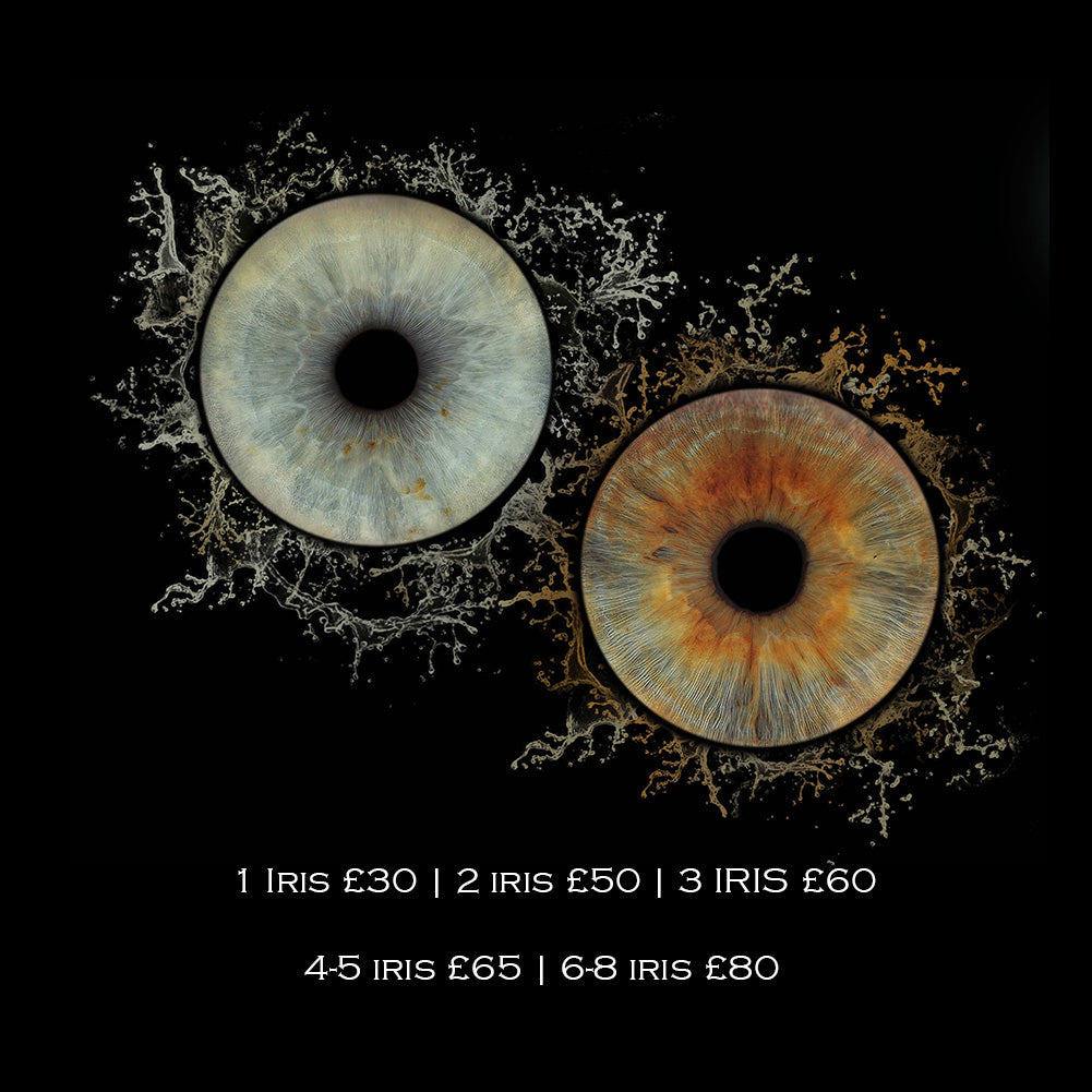Each person's iris shoot will last around 10 minutes. For home visits, please allocate around 15 minutes for setup of our portable studio. Once your iris has been captured, we can discuss desired effects and explore options for printing your iris creation onto wall art. We then take payment (by card or cash) for your wall art, or through PayPal in three if you prefer to stagger your payments.