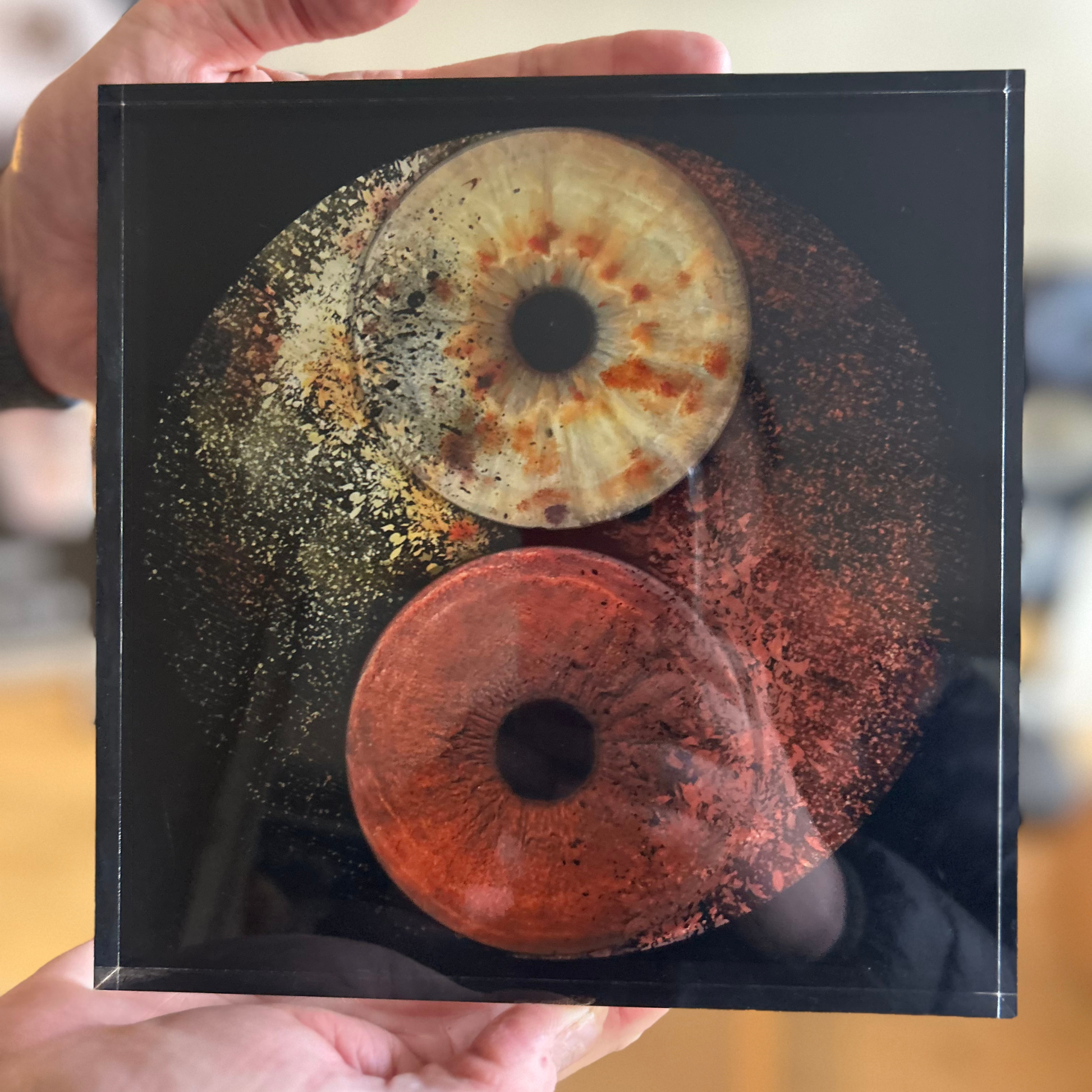 Our stunning iris blocks are crafted from 20mm thick acrylic, perfect for displaying on any flat surface - whether it’s a shelf, desk, or mantelpiece. When light catches the iris design, the colours and textures come alive, creating a vibrant and amplified projection of your unique iris. These square blocks are ideal for showcasing 1, 2, 3 or 4 irises, in either 6x6 or 8x8 inches.