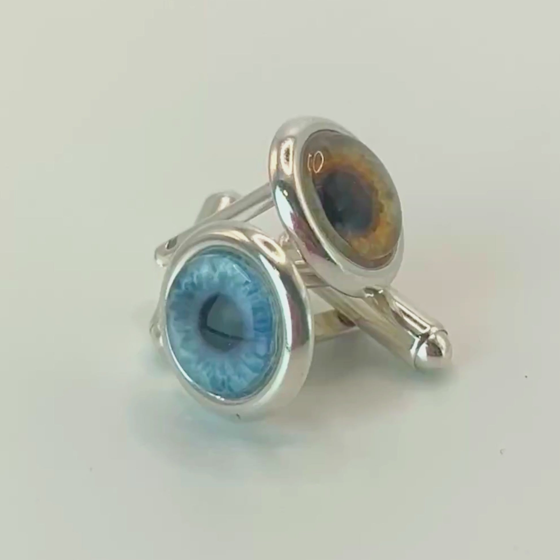 A stunning set of cufflinks made in solid silver, the 10mm bezel holds your iris photo, and finished with a glass cabachon to excentuate the colours and textures of the iris.